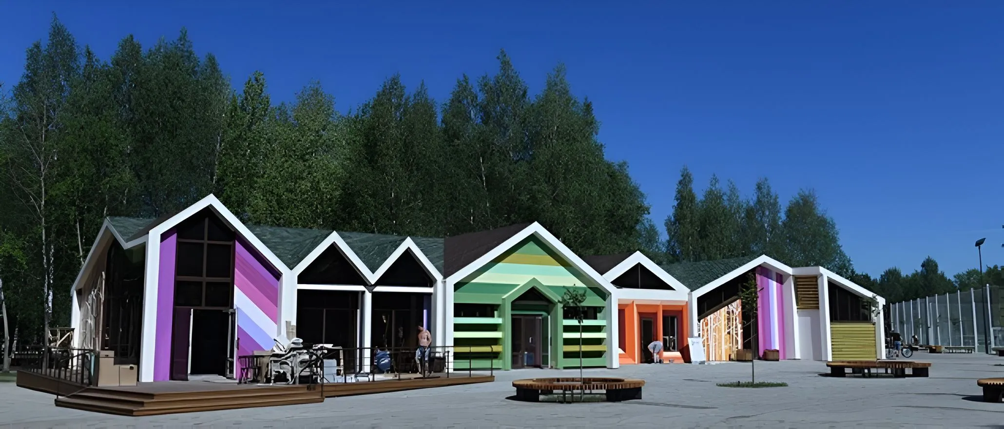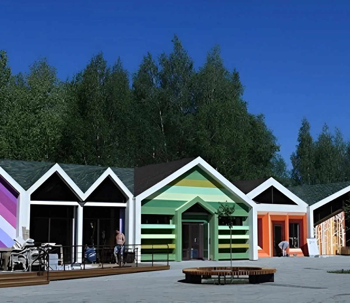Зона отдыха с прогулочными дорожками между хвойными деревьями. Здесь можно покататься на колесе обозрения или на одном из 26 аттракционов.